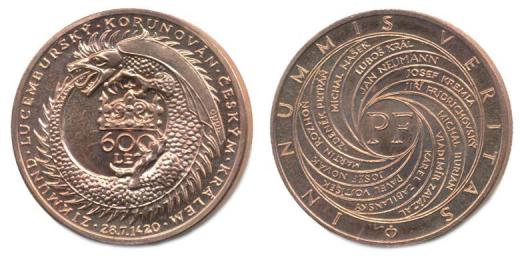 Praha - PF 2020, 600.výr.korunovace Zikmunda Lucemburského Stočený drak kolem koruny, opis / ve spirále jména 12 členů výboru Sign.Oppl, Cu 30 mm, 12,4 g, nákl. 13 ks, MF.C13/18c_R!