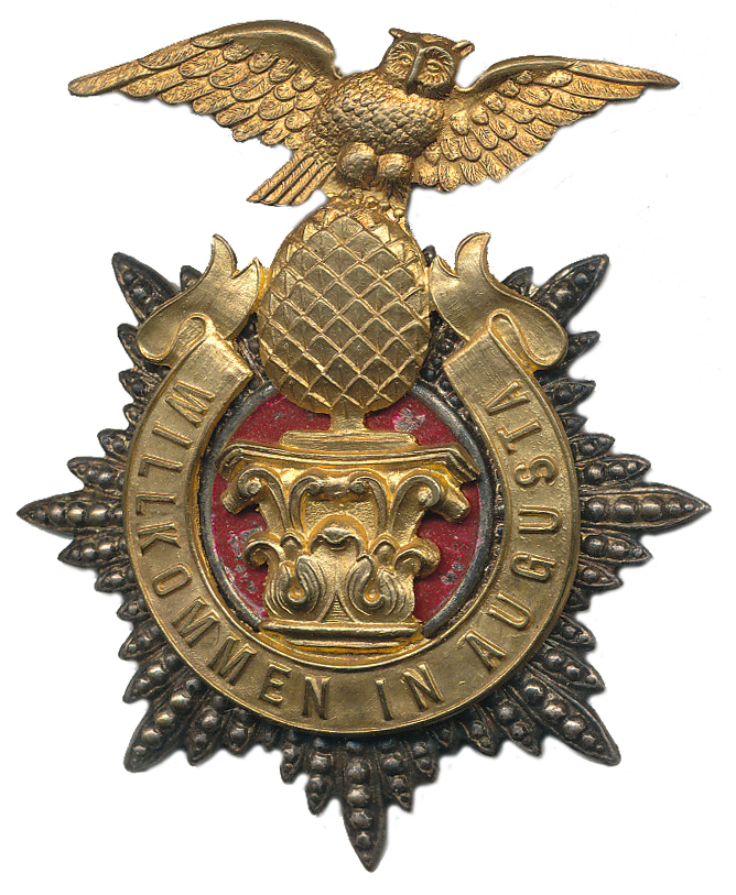 Augsburg (Augusta Vindelicorum) - Uvítací řád, briliantová hvězda, na ní výr drží šišku na hlavici městského znaku, opis na stuze WILLKEMMEN IN AUGUSTA, Plech 65x55 mm_ouško
