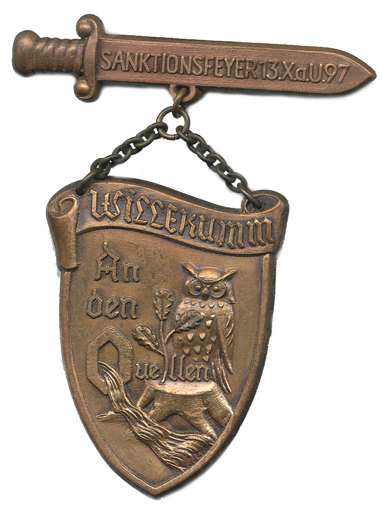 Bad Kissingen (An den Quellen) - Uvítací odznak, štít se stuhou nahoře s nápisem WILLEKUMM, výr u dubového pařezu, z písmene Q vytéká pramen, Cu 53x41 mm, 2 řetízky připojen meč s nápisem SANKTIONSFEYER 13.x.A.u.97 (1956)_vodorov.zavírací jehlice