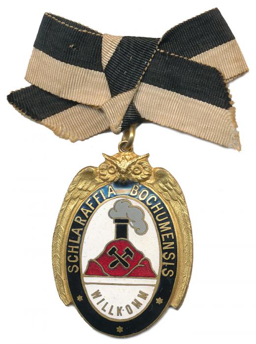 Bochum (Bochumensis) - Uvítací odztnak, zlacený výr drží v křídlech bíle smaltovaný ovál s hornickými symboly, opis WILLKOMM, v černém mezikruží opis SCHLARAFFIA BOCHUMENSIS, Pozlac.bronz 44x31 mm_ouško se stuhou