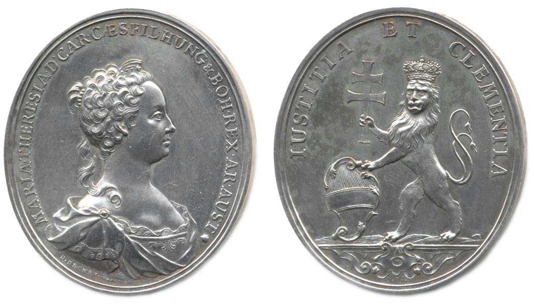 Becker - medaile oválná na korunovaci v Praze 12.5.1743 Poprsí Marie Teresie zprava, opis / korunovaný český lev s rakouským znakem a dvojramenným křížem, opis, Sign., D.Becker Postř.bronz 42x48 mm, Nov.XXI/B-48 - novoražba znač.HMA 1958