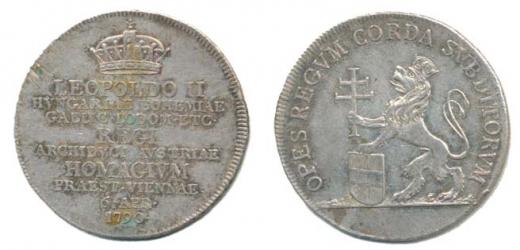Větší peníz na holdování ve Vídni, 1790 Koruna, nápis / stojící lev, znak a Svatoondřejský kříž, opis, Ag 25 mm, 4.35 g, Nov.XVI/B-2b, Mo.2190, Ho.3239