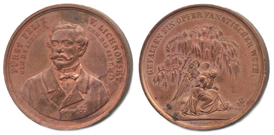 Drentwett - medaile na zavraždění člena národního shromáždění 1848#Cu Poprsí čelně, dvojitý opis / dva stromy, uprostřed dvouhlavý orel, opis německý parlament 1848, Cu 37 mm, JF.1169_R!