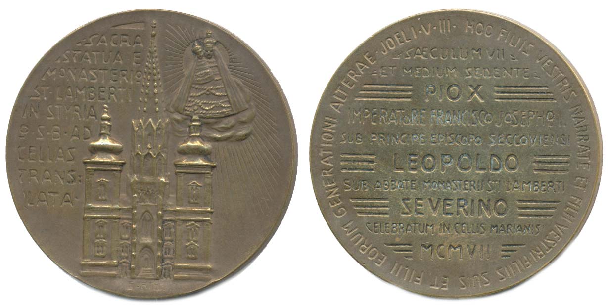 K 750.výr. přenesení sochy Matky boží do kláštera 1907, pohled na klášter, 9řádk.nápis / 10řádk.nápis, opis Nesign., Bronz 50 mm, Haus.1910, Wu.6074