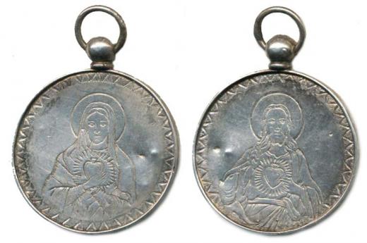 Polopostava Krista se svatozáří čelně / Panna Marie s hořícím srdcem, Ag gravírovaná medaile 28 mm, 4,90 g _2x dr.úhoz dob.soudkov.ouško