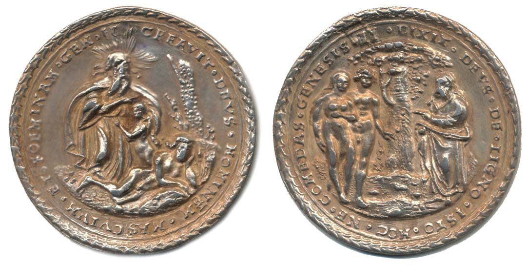 Stvoření Evy, lat. opis / vyhnání z Ráje - první hřích, lat.opis autor: Heinrich Aldegrever, Ag ražená medaile 42 mm, 18,30 g, Ka.416, tab.LIII/9, Enz.202, Do.4385, Kill.5823_oprav.dírka RR!