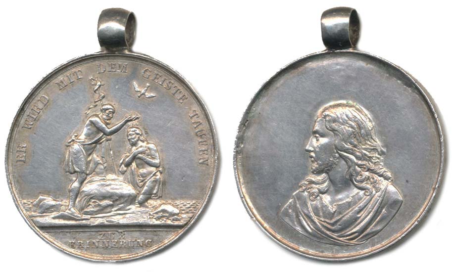 H.Lorenz - křestní medaile b.l. (cca 1815) Poprsí Krista zleva / sv.Jan křtí Krista v Jordánu, nad nimi holubice, symbol Ducha svatého, 2řádk.něm.nápis v úseči, něm.opis, Sign., Ag 36 mm, 14,29 g, Gr.1384 pod._kolmé soudkov. ouško tém.