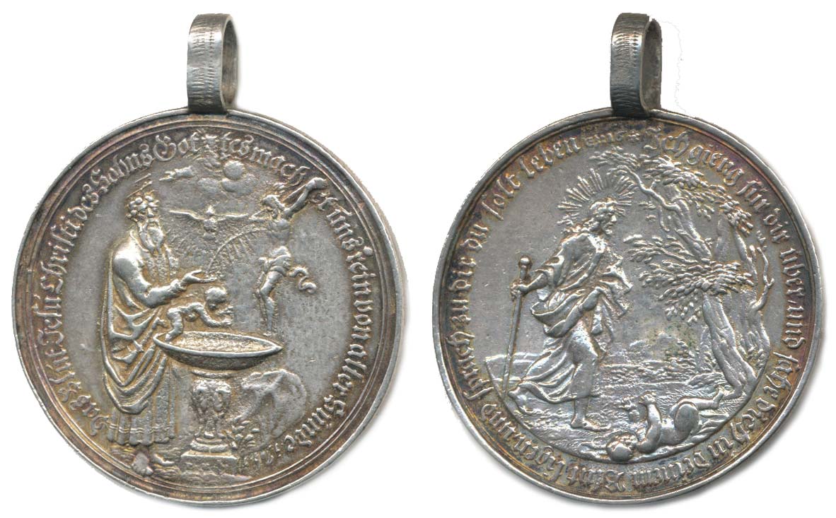 P.H.Müller - kráčející Kristus v krajině, na zemi ležící dítě pod stromem, opis / Bůh otec křtí dítě, Kristus a kříži, Duch svatý, opis Sign. (z let 1690 - 1718), Ag 48 mm, 26.36 g_dob.ouško