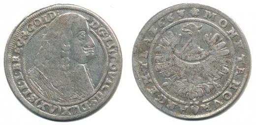 XV Krejcar 1663 bz, SJ.410/144, Kop.5435 - rovné vlasy + řasený šat _č.por.stř.v rev.