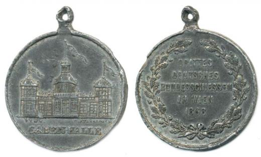 Vídeň - 3.německé spolkové střelby 1868 Pohled na střelnici, v úseči nápis GABEN-HALLE / 5řádk.nápis ve věnci, Sign.O.Steinboeck, Sn 33 mm_hr.v rev., dr.hry orig.ouško