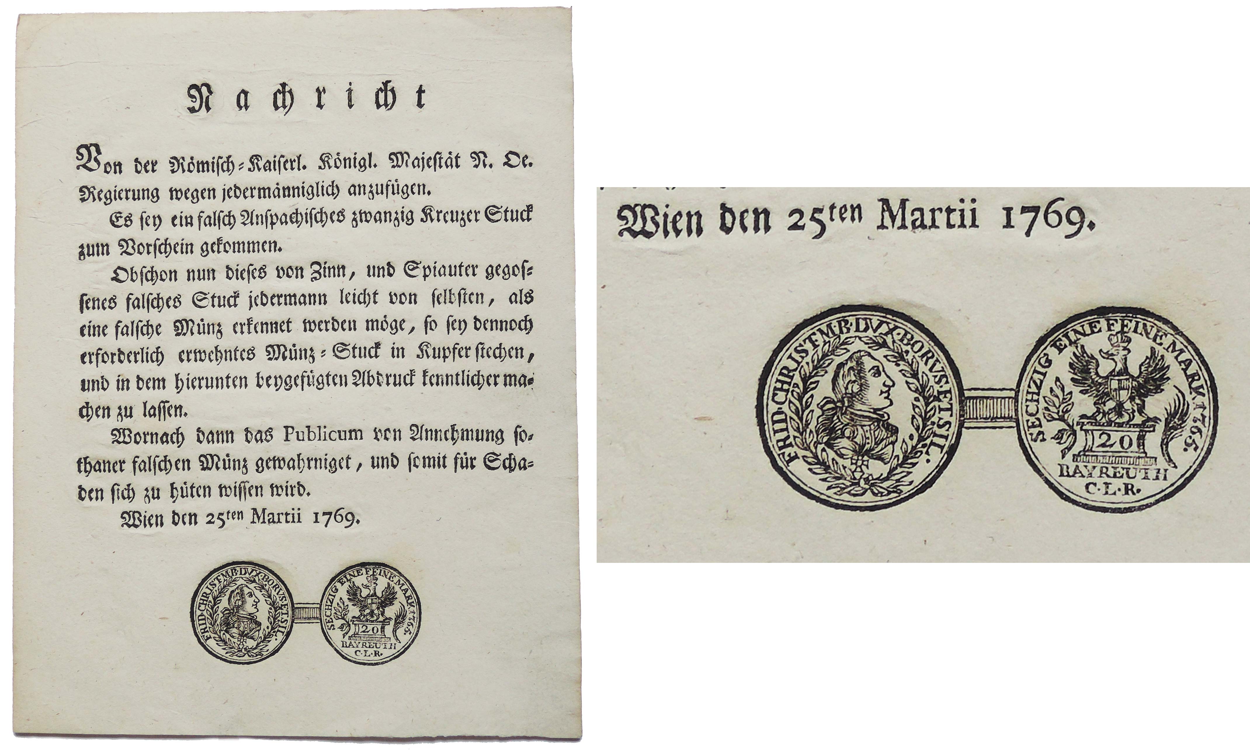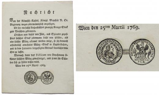 Marie Terezie - zpráva - upozornění z 25.3.1769 na přicházející falešné anspašské dvacetikrejcary, německý text, rytina mince 160x205 mm