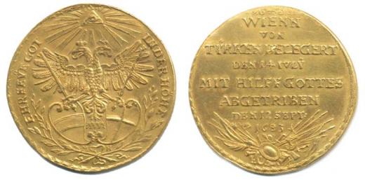 3 dukátová medaile na porážku Turků u Vídně 12.9.1683 Pod Božím okem dvouhlavý rakouský orel se dvěma znaky, opis / 8řádk.nápis nad vojenskými atributy, Sign.M-M (M.Mittermaier) a M-H (M.Hofmann), Au 28 mm, 10,94 g, Hirsch.20, Mo.921, LG.XV/70 (Ag) _RR!