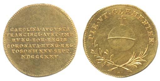 3/4 Dukát na uherskou korunovaci manželky Caroliny Auusty Bratislava 25.9.1825, říšské jablko, opis / 6řádk.nápis Nesign., Au 20 mm, 2.72 g, Ho.3471, Wi.5458_obrouš.hr. tém.