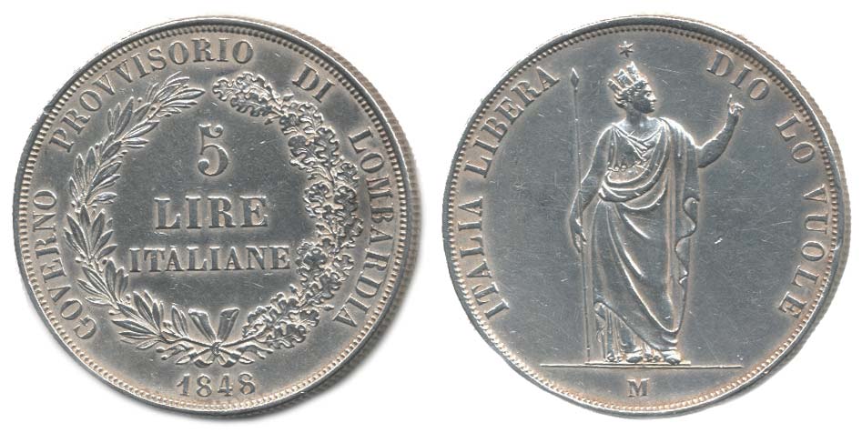 5 Lira 1848 M - dlouhá stuha, Cr.22, AM.1b, Her.3, Ves.12b