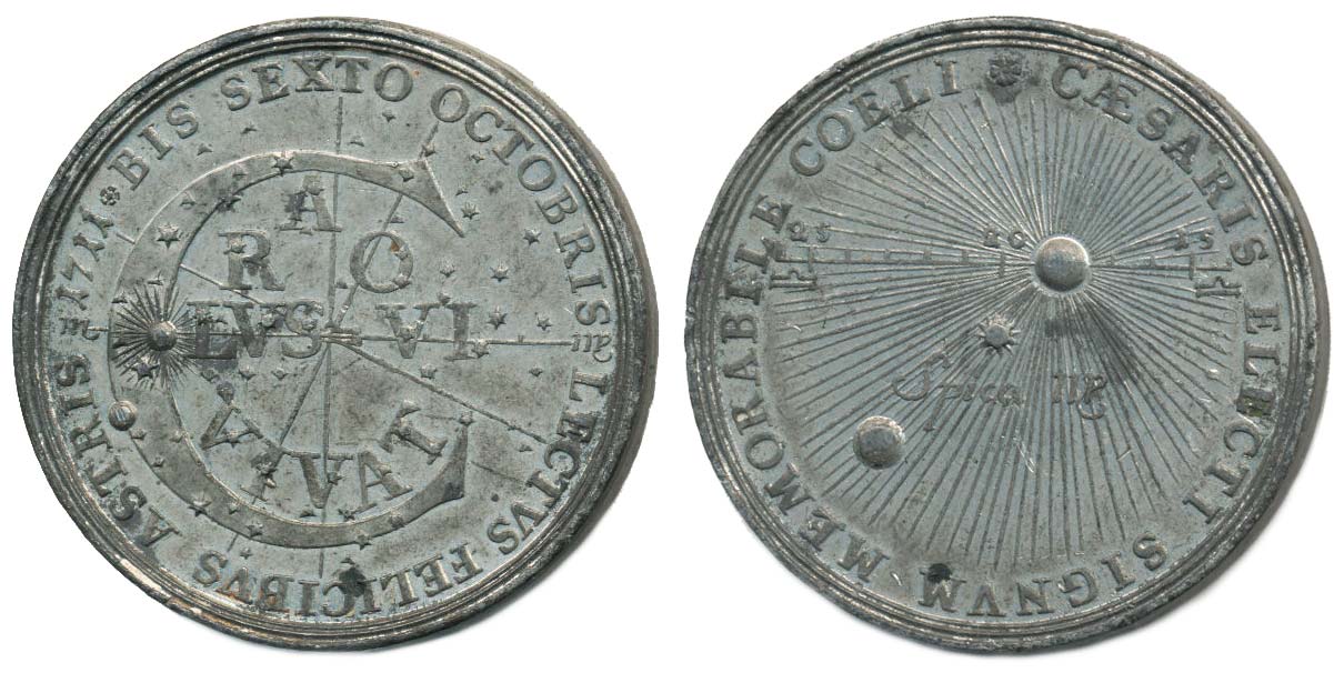Nesign. - medaile na volbu za římského císaře 12.10.1711 Velké písmeno C, v něm je nápis ve čtyřech řádcích, v pozadí hvězdná obloha, opis / horoskop císaře - slunce s paprsky, hvězda, zeměkoule, opis, Sn 49 mm, 36,27 g, Nov.XI/E-7c, LG.XV/447_RR!