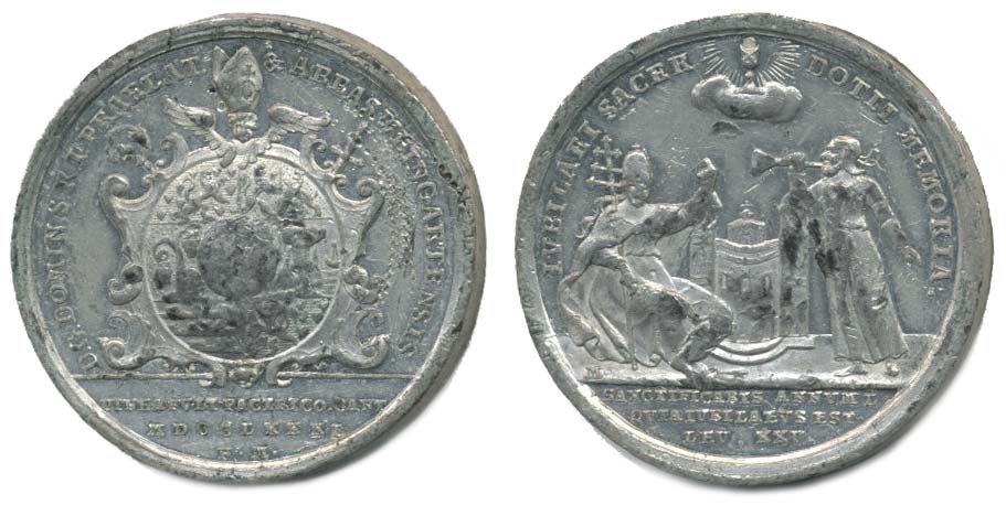 Dominikus Schnitzer - medaile k 50.výr. kněžství 1731 - 1781 Dvě postavy pod Božím okem, opis / široký zdobený znak, opis Sign.F.M. (Matzenkopf), Sn 35 mm, 20,22 g_tém.