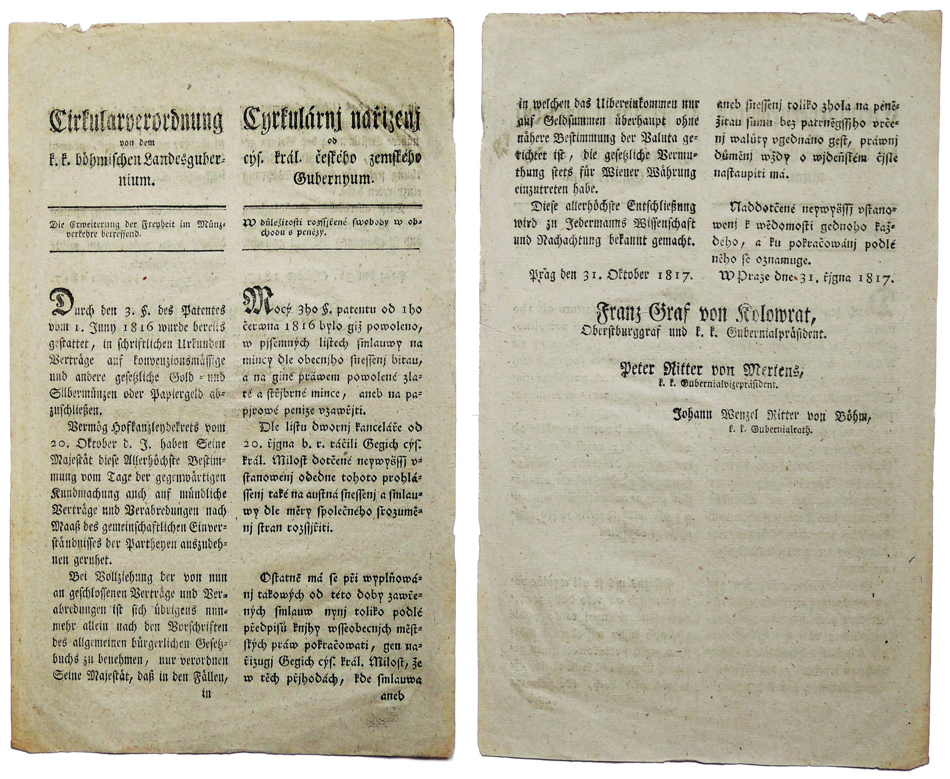 František II. - cirkulář c.k. Českého zemského gubernia o důležitosti rozšířené svobody obchodu s penězi, dne 31.10.1817, podepsán guberniální prezident František hr.Kolowrat, 2 strany, něm.-český text 200x330 mm