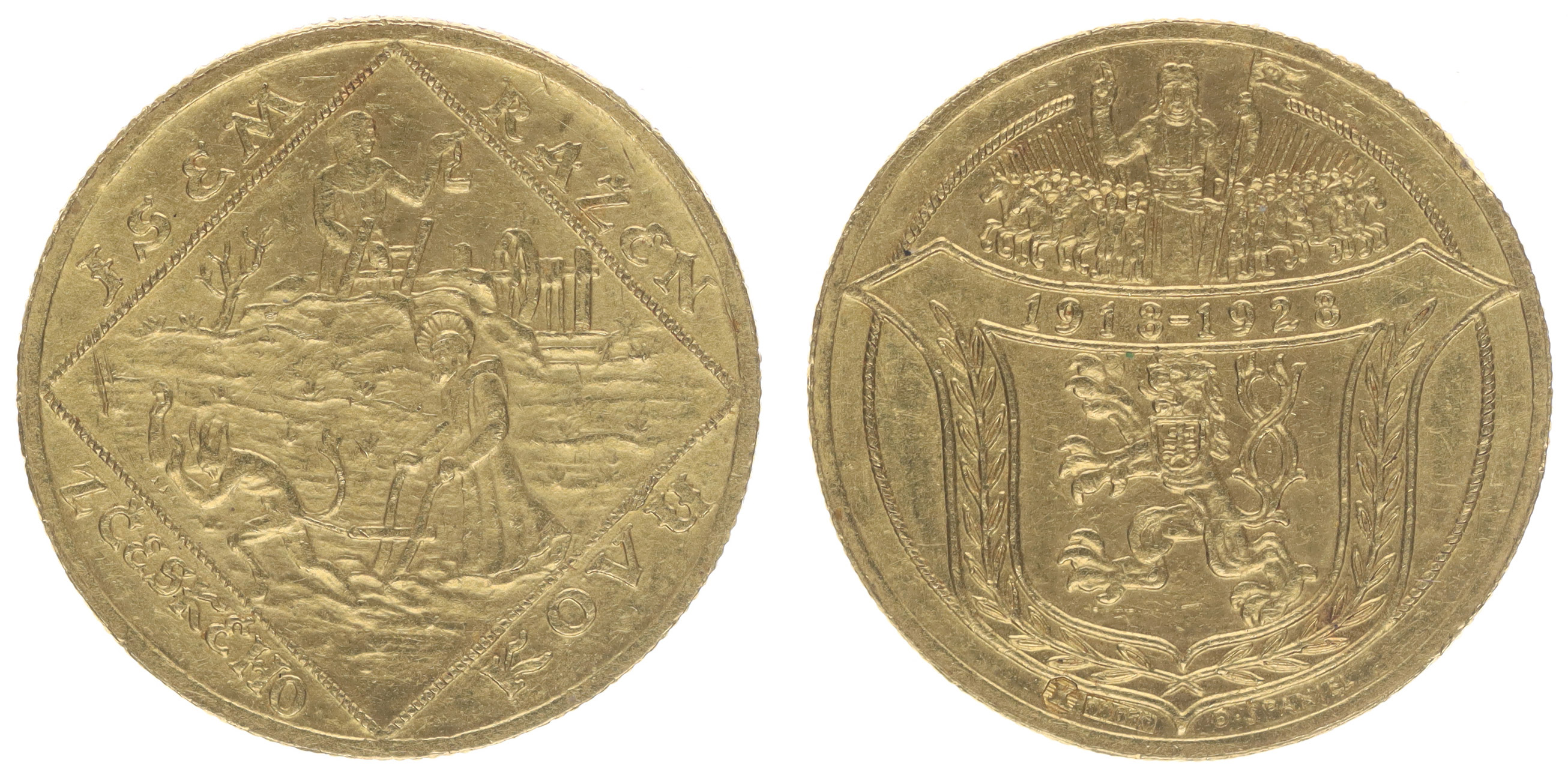 O.Španiel - Malá medaile na 10 let republiky, 1928 Sv.Prokop orá s čertem, havíř / český lev, Sv.Václav s rytíři, Sign., Punc., Au 987/1000, 22 mm, 6.89 g