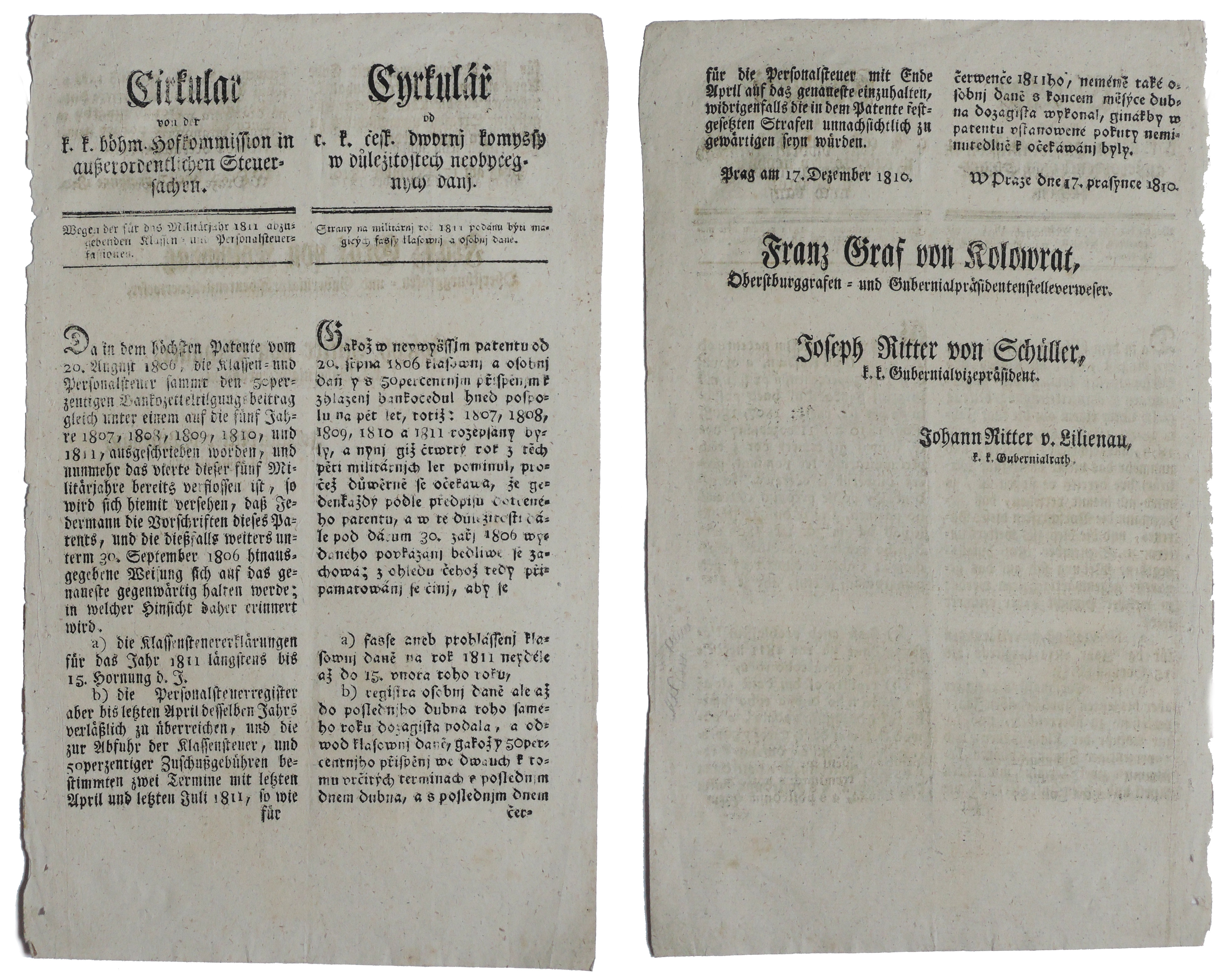 František II. - cirkulář c.k. České dvorní komise ze 17.12.1810 o důležitosti mimořádných vojenských daní, splatných do července 1811, 2 strany, německo-český text 195x320 mm