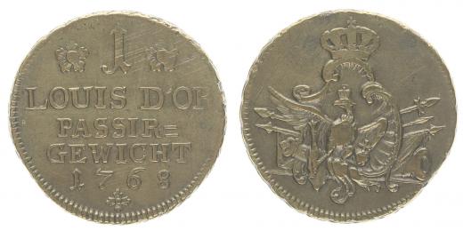 Mincovní závaží "1 Louis d´or Passier Gewicht 1768" Mosaz 22 mm, 6,48 g_dr.just. v av.