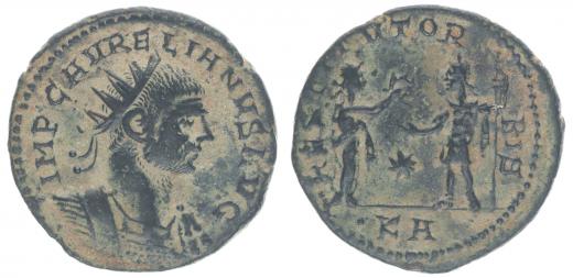 AE Antoninianus, Rv:"RESTITVTOR.ORBIS.", Victorie věnčí císaře, podobný S.3165, RIC.389 - mincovna Tripolis