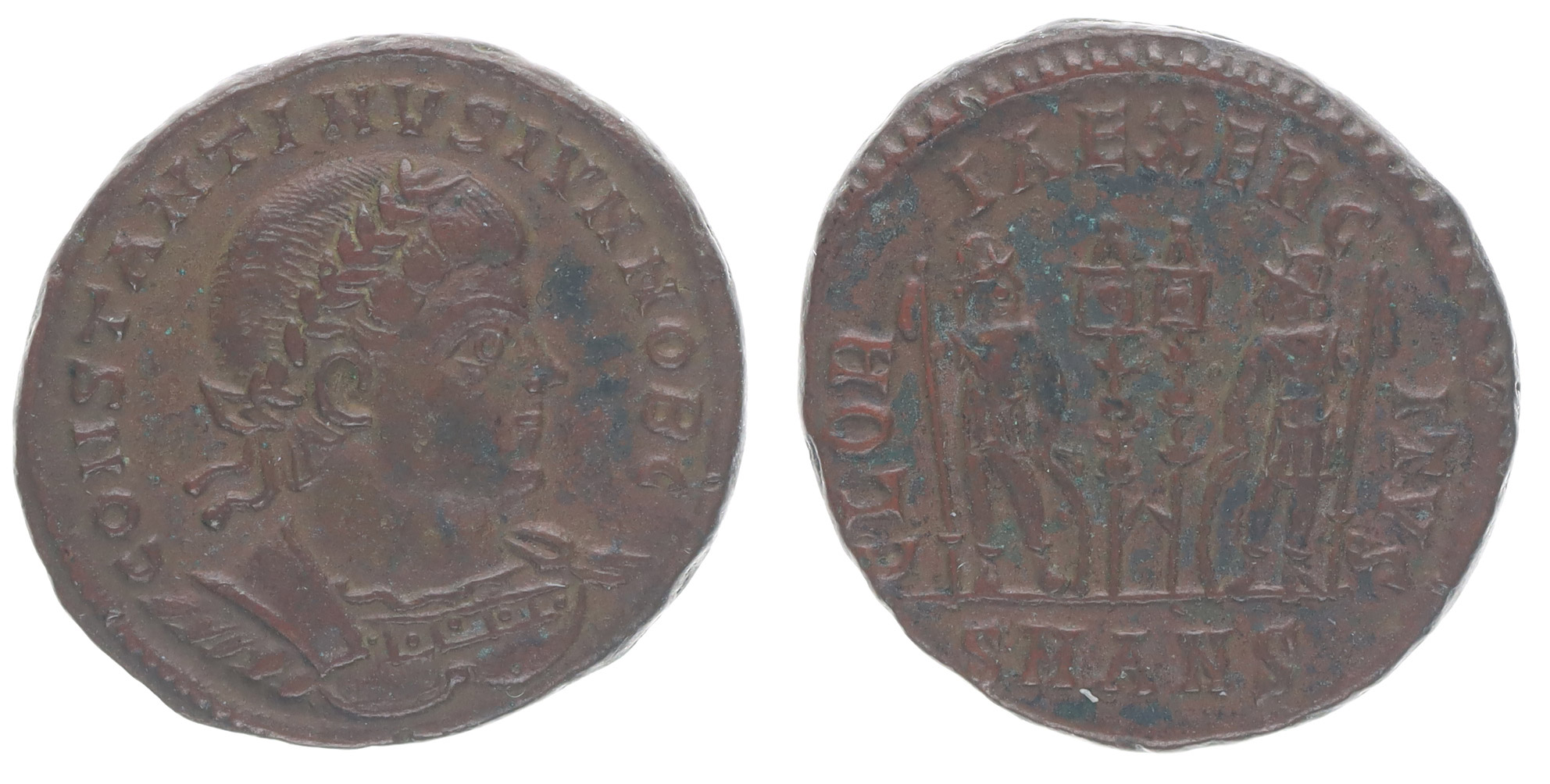 AE3/4, Rv:"GLORIA.EXERCITVS.", dva vojáci s kopím minc.Antiochia, S.3851, C.12, RIC.87