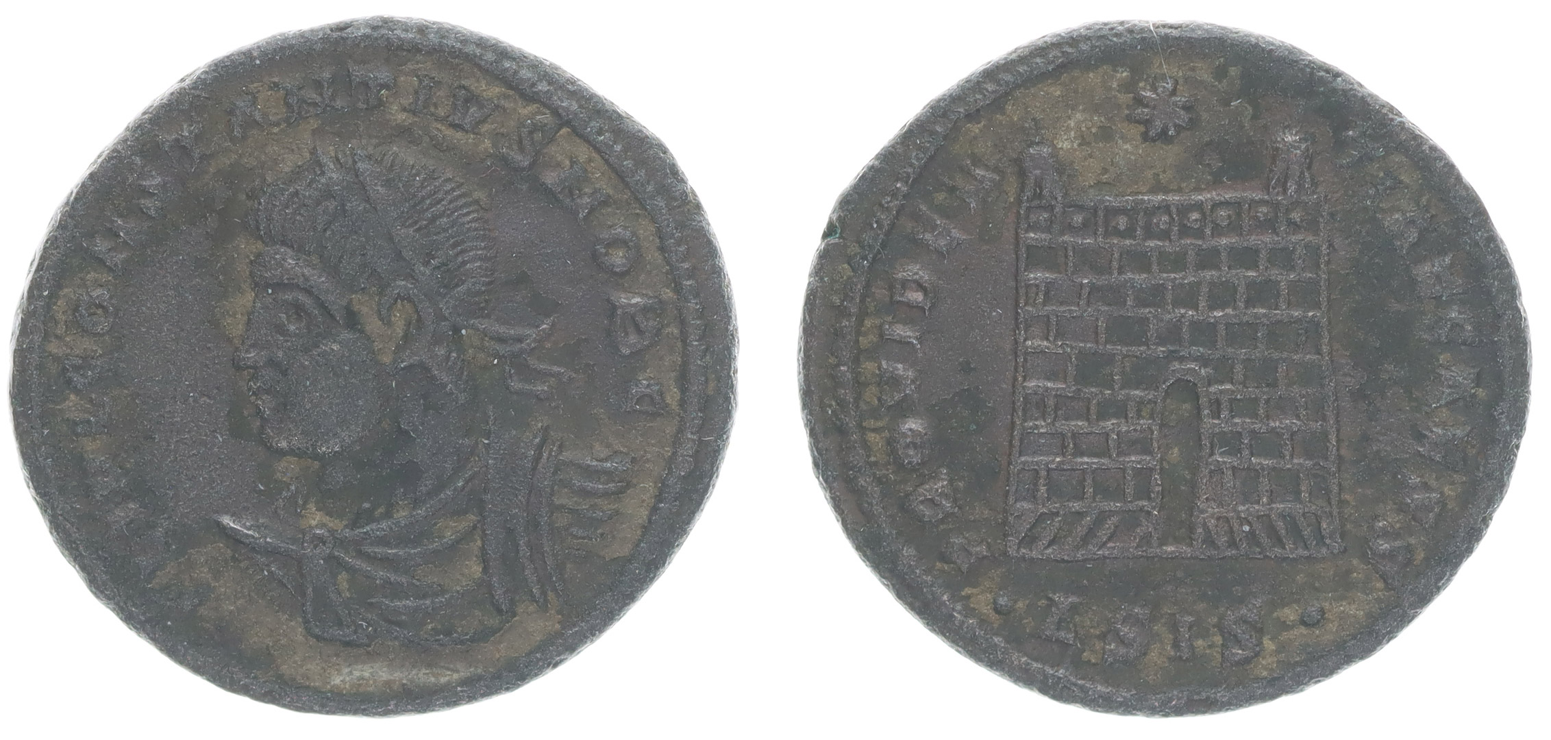 AE3, Rv:"PROVIDENTIAE.CAESS.", táborová brána minc.Siscia, S.3884, RIC.203