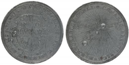 Nesign. - medaile na volbu za římského císaře 12.10.1711 Velké písmeno C, v něm je nápis ve čtyřech řádcích, v pozadí hvězdná obloha, opis / horoskop císaře - slunce s paprsky, hvězda, zeměkoule, opis, Sn 49 mm, 36,25 g, Nov.XI/E-7c, LG.XV/447_RR!