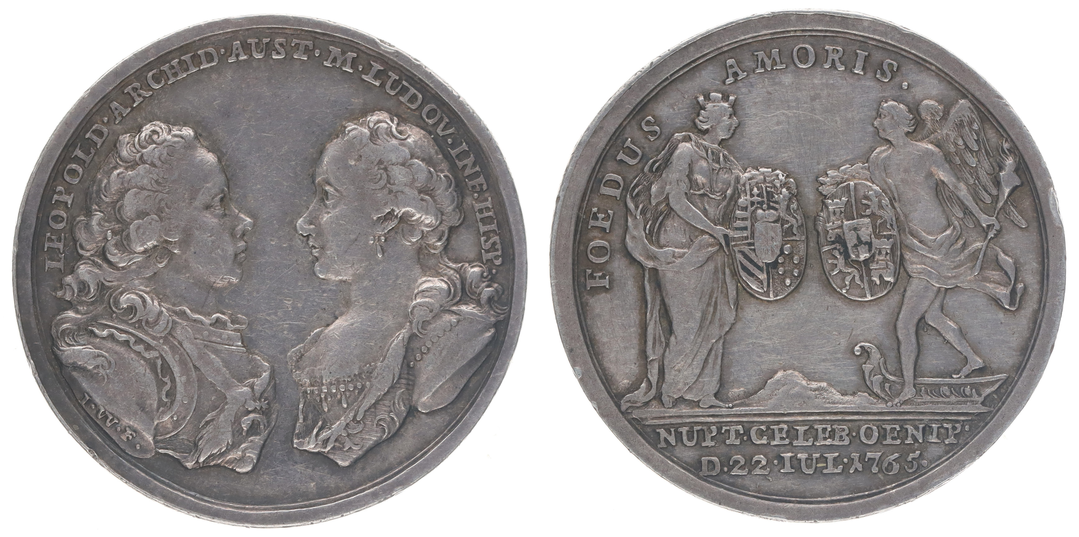 I.Wirth - svatební jeton, 1765#Ag Poprsí proti sobě, opis / alegorické postavy se znaky na štítech, 2řádk.nápis, opis, Sign., Ag 29 mm, 8.33 g, Mo1946, LG.XIV/204 We.8266, SD.179_dr.hr.