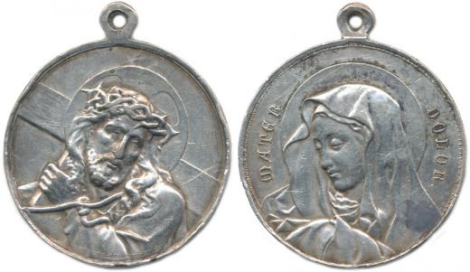 Poprsí Krista s trnovou korunou a křížem čelně / hlava Panny Marie Bolestné zleva, opis (dle obrazu Madonna del Dito) Alpaka 40 mm_dr.hr. orig.raž.ouško