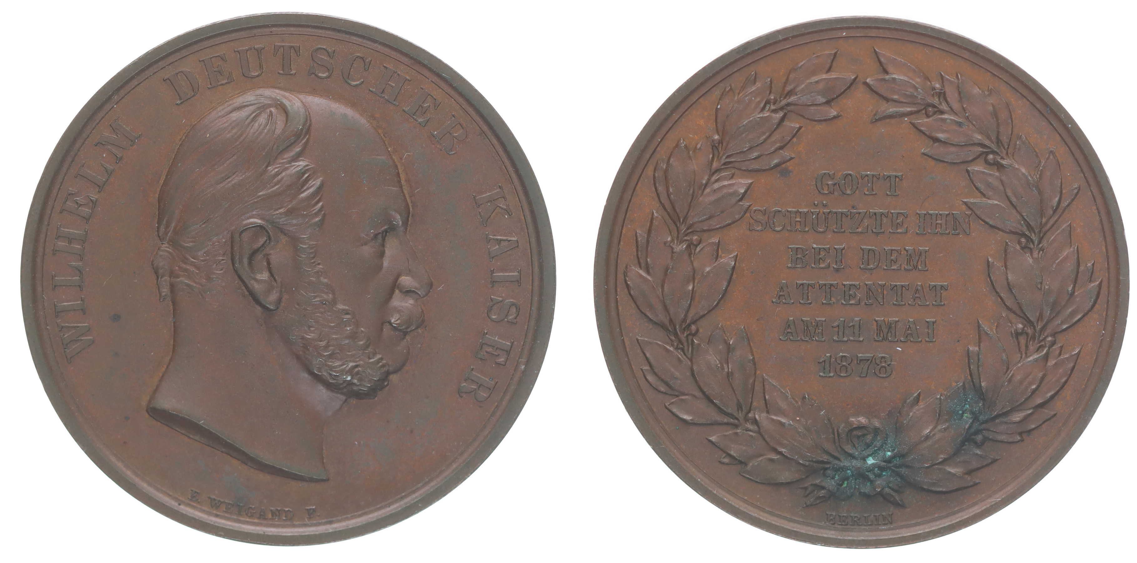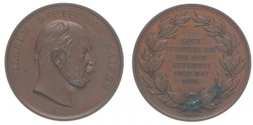 Vilém I. - medaile na pokus o atentát 11.5.1878 Portrét císaře zprava, opis / 6řádk.nápis ve věnci Sign.E.Weigang Berlin, Bronz 30,5 mm, 13,8 g