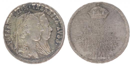 Větší jeton na návštěvu v Budapešti 25.6.1780 v souvislosti se školskou reformou v Uhrách, dvojportrét zprava, opis / 12řádk. nápis, Nesign., Ag 26 mm, 3.99 g, Mo.2096, LG.XIV/301_n.just.
