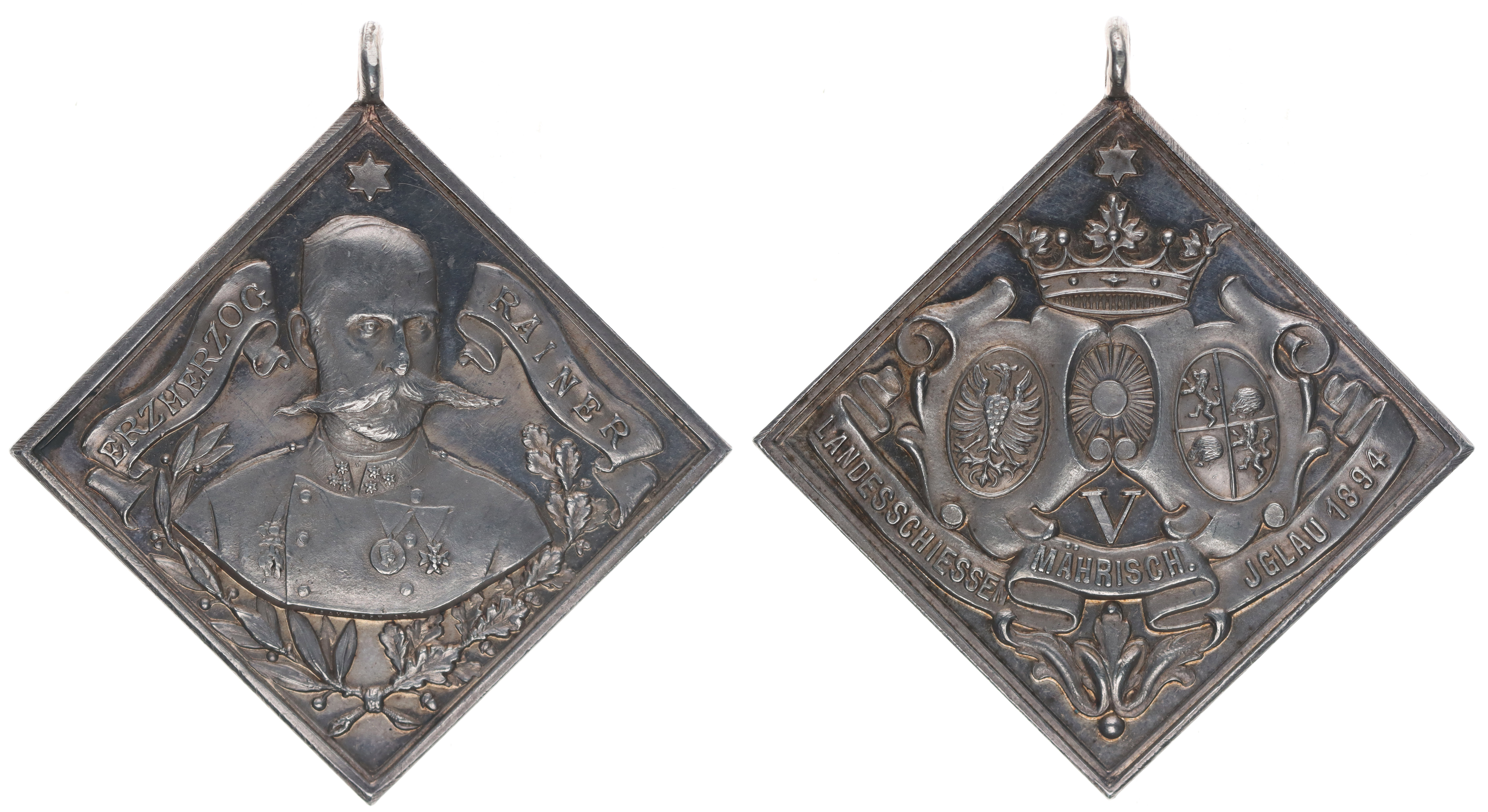 Jihlava (Iglau) - V. moravské zemské střelby 1894 Poprsí arc.Rainera čelně, opis / korunované dva znaky a terč, nápis na stuze, Sign.A.Schwerdt, Ag klipa 35x35 mm, 24,33 g