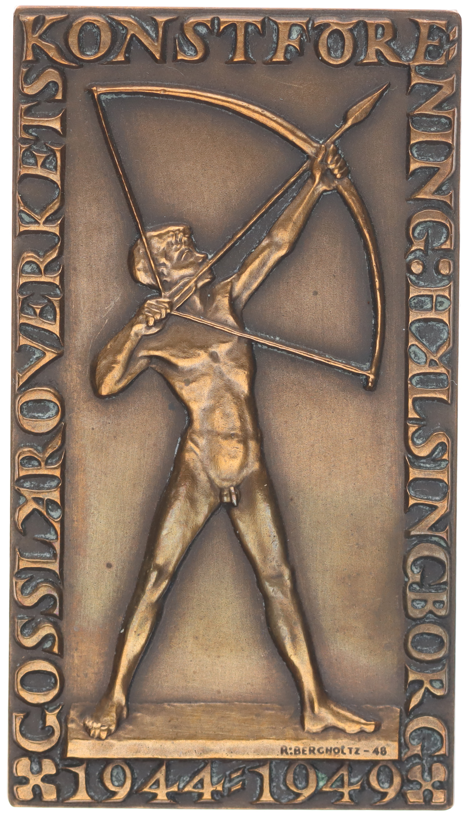 Švédsko - lukostřelecká plaketa, 1944 - 1949, stojící lukostřelec, opis, v rev.vyryto LEIF LINDSTRAND Sept.1948 - Sept.1950 Sign.R.Bercholtz, Bronz 33x59 mm, 34,34 g