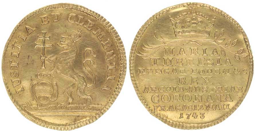 Menší korunovační žeton na korunovaci v Praze 12.5.1743 Korunovaný lev se znakem a křížem, opis / 8řádk.nápis pod korunou Au 21 mm, 2.63 g, Nov.XIII/G-3a, ČS.1313_RR!