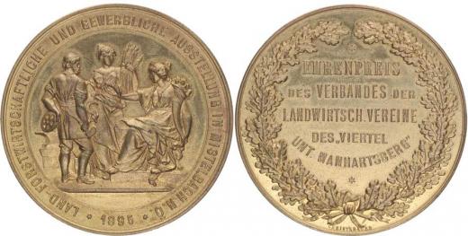 Mistelbach - lesnická a živnostenská výstava - čestná cena 1895 Tři alegorické postavy, opis / 5řádk.nápis ve věnci Sign.Christlbauer, Pozlac.bronz 60 mm