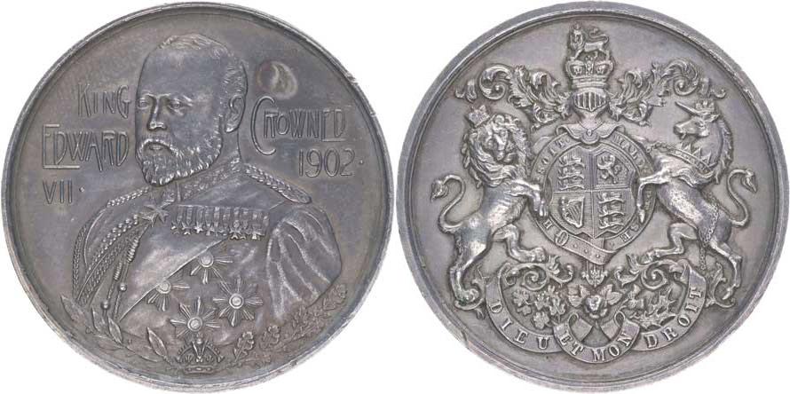 Edward VII. - medaile ke korunovaci 1902 Poprsí mírně zleva, 3řádk.nápis / okřídlený velký znak držený lvy Nesign., Postř.med. 45 mm, 34,33 g