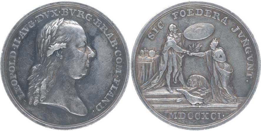 Medaile na holdování flanderských stavů, 1791#Ag Poprsí zprava, opis / císař přijímá hold Belgie, korunov.klenoty, opis, Nesign., Ag 39 mm, 25,53 g, Nov.XVI/K-2b, Mo.2229, Ho.3259