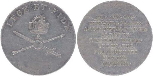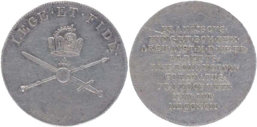 Větší peníz na korunovaci ve Frankfurtu, 14.VII.1792 Koruna, žezlo, meč a jablko, opis / 9-řádkový nápis, Nesign., Ag 25 mm, 4,41 g, Nov.XVII/E-7b, Mo.2269, Ho.3334