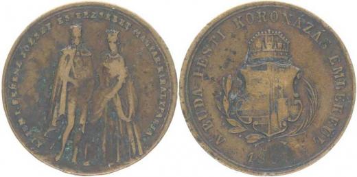 J.C. - medaile na uherskou korunovaci, 1867#Mos Dvě stojící postavy, maď.opis / uherský znak, opis Sign.(Josef Christlbauer), Mosaz 20.5 mm, Nov.XIX/D-10a