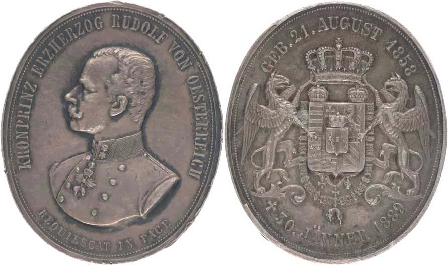Radnitzky - oválná úmrtní medaile, 30.1.1889 Poprsí zleva, opis / korunovaný znak nesený dvěma gryfy, opis, Sign., Punc., Ag 34x40 mm, 24.7 g, ČS.1653_dr.hry, dr.rys.