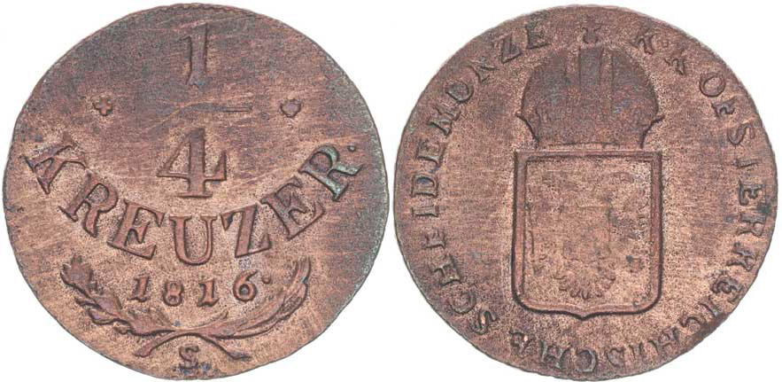 Cu 1/4 Krejcar 1816 S, minc.Smolník