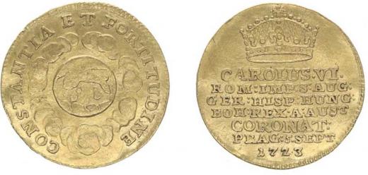 3/4 Dukát - korunovace na českého krále 5.9.1723 v Praze Pod korunou 7řádk.text / zeměkoule v oblacích, opis Au 20 mm, 2,70 g, Nov.XI/Z-8a_dr.zvln. R!
