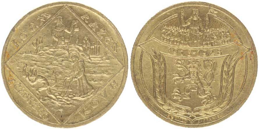 O.Španiel - Malá medaile na 10 let republiky, 1928 Sv.Prokop orá s čertem, havíř / český lev, Sv.Václav s rytíři, Sign., Punc., Au 987/1000, 22 mm, 6.99 g