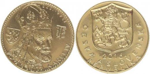 Dukát - k 700.výr.narození Karla IV. 1316 - 2016 Portrét čelně mírně zprava (vzor dukát 1978) / čs.znak, opis Česká a slovenská republika, ryz.986, 19,75 mm, 3,49 g, náklad 300 ks, čís.153minc.Kremnice_orig.etue se smalt.českým lvem + certifikát