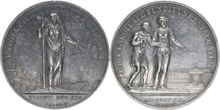 Bratislava - na rekonstrukci nemocnice Milosrdných bratří 1830 Stojící alegorická ženská postava, 2řádk.nápis v úseči, lat.opis / dvě postavy před budovou nemocnice, 2řádk.nápis v úseči, lat.opisSign.I.Lang.F., Ag 40 mm, 26,30 g_dr.hr. R!