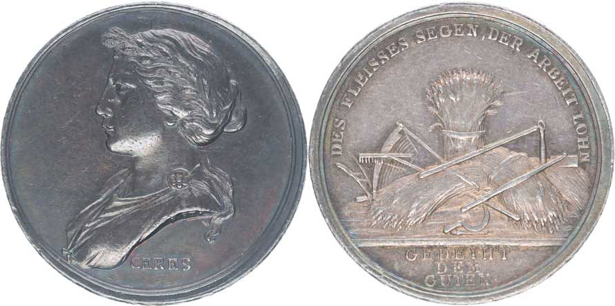 Ceres - medaile k požehnání úrody, b.l. Antická bohyně zleva, nápis / zemědělské atributy, 3řádk.nápis v úseči, opis, Ag 32 mm, 9,42 g
