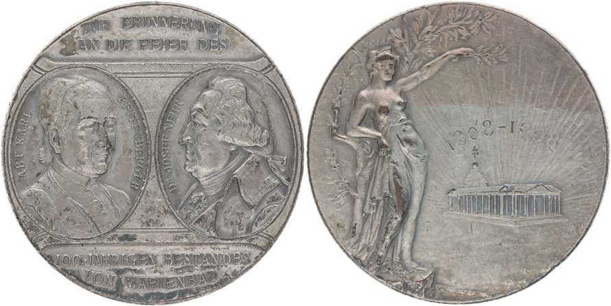 Sto let založení lázní, 1908#Postř Oválné medailonky s portréty zakladatelů, něm.nápis / ženská postava, pavilon, nápis, Sign.C.Lauer Nürnberg, Postř.bronz 40 mm