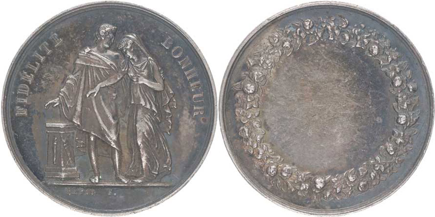 Petit - svatební medaile b.l., stojící muž a žena přísahají na bibli, opis / po obvodu věnec, Sign., Ag 33 mm, 16,05 g