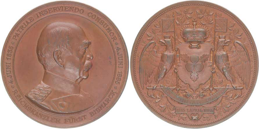Otto von Bismarck - 70 let narození, 1.IV.1895 Poprsí zprava, opis / korunovaný rodový znak s rodovým heslem Sign.K.Schwanzer, Bronz 38 mm, 26,95 g